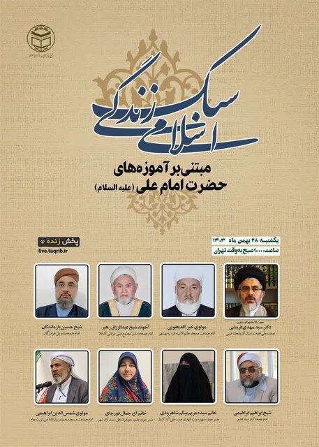 به گزارش ایسنا، وبینار “سبک زندگی اسلامی مبتنی بر آموختههای حضرت امام علی علیه السلام” با حضور شخصیتها و اندیشمندانی چون حجت الاسلام والمسلمین سید مهدی قریشی، نماینده ولی فقیه در استان آذربایجان غربی و امام جمعه ارومیه، مولوی خیر الله یعقوبی امام جماعت مسجد خاتم الانبیاء قره تپه بهشهر، آخوند شیخ عبدالرزاق رهبر امام جمعه و مدیر مجتمع دینی عرفانی آق قلا، شیخ حسین بازماندگان امام جمعه بندرپل هرمزگان، شیخ ابراهیم ابراهیمی امام جمعه کنار سیاه قشم، سیده مریم بیگم شاهرودی مدیر حوزه شهیده بنت الهدی صدر علی آباد کتول، آیجمال قورچای مدیر حوزه علمیه خواهران اهل سنت آزاد شهر، مولوی شمس الدین ابراهیمی امام جماعت مسجدمحمدرسول الله(ص) تربت جام برگزار میشود.